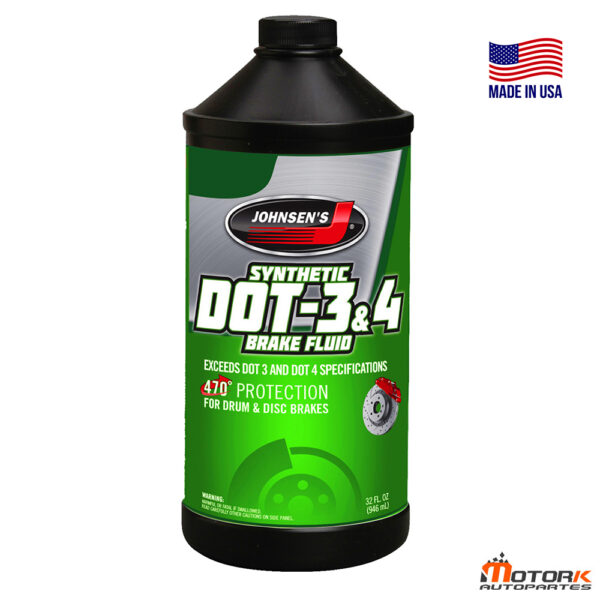 JOHNSEN’S; Un fluido hidráulico de calidad sintética de primera calidad que contiene ingredientes especiales para evitar el bloqueo de vapor y la absorción de humedad. Excede los requerimientos para ambos fluidos DOT 3 y DOT 4.